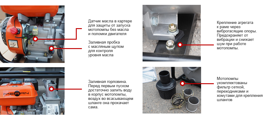 Мотопомпы с высокой эффективностью откачивают воды с размером частиц до 6мм: речные, колодезные, подвальные. Могут использоваться для водоснабжения, полива, откачки дренажных вод или отведения воды во время половодья.