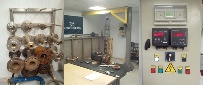 Стенд предназначен для испытания максимально возможного количества насосов. Текущие значения расхода, давления, токов, напряжений и потребляемой мощности могут наблюдаться на встроенном в панель шкафа управления дисплее. Насос и соответствующие трубопроводы соединяются посредством болтов и специальных переходников.
